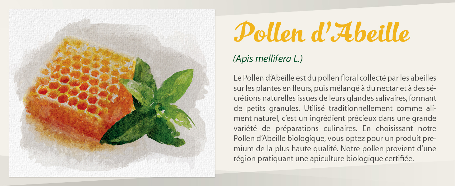 Ingrédient : pollen d’abeille biologique (ingrédient unique)